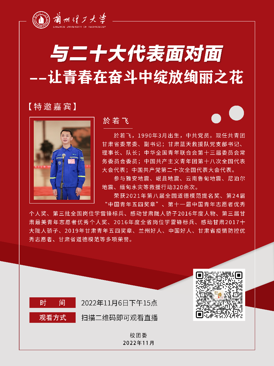 为深入学习宣传贯彻党的二十大精神,引导青年强化学思践悟,牢记使命担当,推动二十大精神入脑入心、落地生根,校团委特邀请中国共产党第二十次全国代表大会代表、甘肃省蓝天救援队队长於若飞在线传达二十大精神,分享参会经历与感悟,讲述奋斗故事。邀请广大师生届时观看。