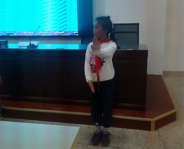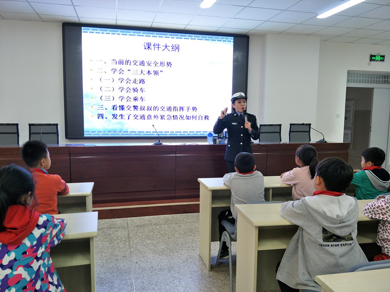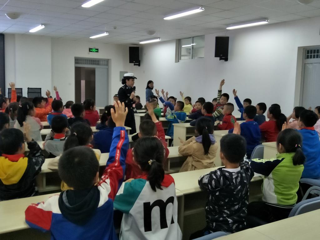 柳警官通过事故案例、视频、图片、儿歌朗读等形式,从步行、骑车、乘车、横穿马路以及过斑马线等方面的安全常识和注意事项给同学们做了详细的讲解,用大家喜闻乐见的方式,对师生们进行了深入教育。柳警官还给学生们讲解和示范了交通指挥手势,同学们积极学习模仿,一个个化身为可爱的小交警。最后,进行了“有奖问答”,同学们热情高涨,纷纷踊跃答题。