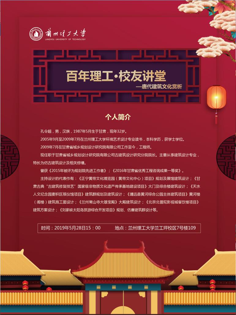 5月28日下午,设计艺术学院在七号楼109教室举办了以“百年理工﹒校友讲堂” ——唐代建筑文化赏析为主题的讲座。设计艺术学院2009届环境设计校友孔令超担任主讲人,吸引了学院200余名师生参加。