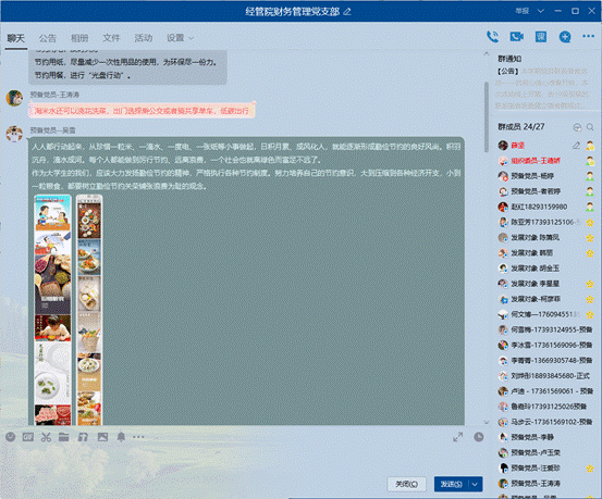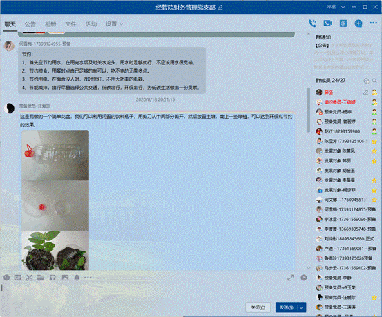 为了积极响应习近平总书记对制止餐饮浪费行为作出的重要指示,在支部内加强宣传教育,切实培养节约习惯,营造浪费可耻、节约为荣的氛围,经管学院财务管理本科生党支部于2020年8月17日召开“厉行节约,从我做起”主题党日活动,每位党员将身边日常学习生活中能够进行的点滴节约行为进行了汇总,做出了表率承诺,积极营造节约氛围,形成长效机制,厉行节约。