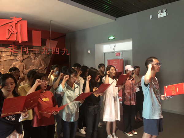 在展馆中,黄溯鑫同学领誓,全体党员面向党旗重温自己手写入党誓词。随后,党员同志们以革命事件时间顺序为线索,一同参观了本次红色主题特展。一件件饱经沧桑的文物,一幅幅生动形象的画作,一段段感人肺腑的事迹,无不彰显了甘肃各族人民英勇无畏、坚韧不拔的革命精神。