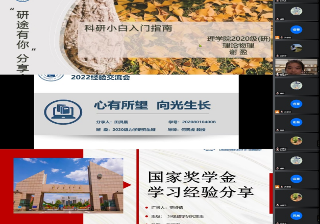 11月5日晚,学校第95期研究生学术论坛理学院分论坛在腾讯会议平台召开,邀请2020级物理、力学、数学专业的三位国家奖学金获得者谢盈、田灵晨、贾娅倩进行汇报,理学院辅导员赵倩倩老师和研一研二全体研究生参会。
