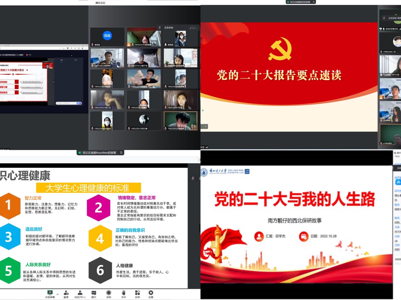 辅导员通过QQ、微信等新媒体,及时发布防控指南、服务提示,召开主题班会,写明讲清防控政策,引导学生理解防疫要求、支持防控安排。针对心理健康困惑学生、被隔离转运的同学,严格落实“一对一”联系制度,精准掌握学生健康状况,动态完善重点关注学生信息台账。先后组织开展“凝心聚力,共克时艰”线上主题班会以及班委会、宿舍长会等,通过聊天、谈心等方式,为学生讲解当前疫情防控形势、疫情防护注意事项、教育学生切实做到不信谣、不造谣、不传谣,严格遵守各项纪律和疫情防控要求,积极响应“请党放心 强国有我”号召,做防疫政策宣传者、遵规守纪践行者、校园阵地守护者。