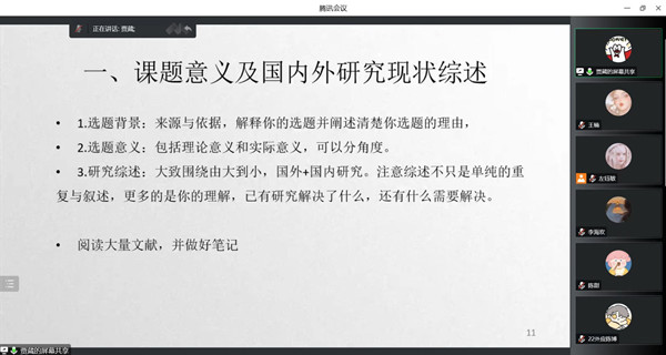 2020级贾葳同学分别从研究生规划和开题经验两个方面进行分享,详细介绍了研究生学习生涯三个特定阶段的主要任务,随后从论文选题、课题研究、研究方法等方面逐一分享开题经验,并多次强调研究生在学习和生活中应时常提出问题并保持思考。接着,2021级李绪清同学分享了学科竞赛经验及技能证书备考经验,详细介绍了雅思和教资的考试类型和内容,并分享了参加各类学科竞赛的丰富经验。最后,全体参会同学进行了热烈讨论。