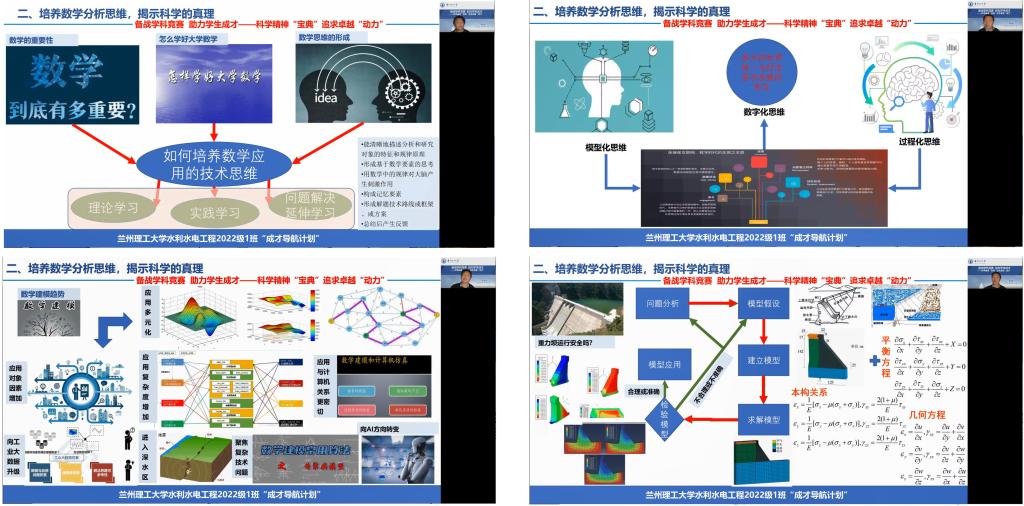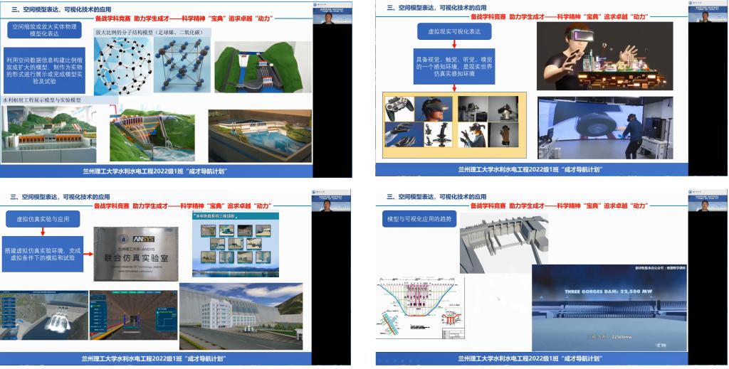 11月13日,水利水电工程2022级1班开展“探究‘模型’表达魅力、彰显‘数字’可视技术”专题活动,活动采用在线腾讯会议的形式。该活动为班级举办的主题在“成才导航计划”系列活动“备战学科竞赛促进学习”活动第三场,活动由班级中数学与数学建模兴趣小组和几何建模与数字化成图及可视化兴趣小组联合策划并实施,通过活动帮助新生梳理学业规划的不足,达到“以学科竞赛为抓手,探索大学成才秘密,开启科学学问之道”主要目的,最终建设优良学风,构建良好学习氛围。活动邀请能源与动力工程2020级卓越班李浩森、能源与动力工程2021级1班石疆涛和水利水工程2021级1班马欢三名优秀学生代表分享大学学习和学科竞赛经验,班主任龚成勇老师并做题为“备战学科竞赛助力学生成才”——科学精神“宝典” 追求卓越“动力”主旨报告,全班同学参加活动。