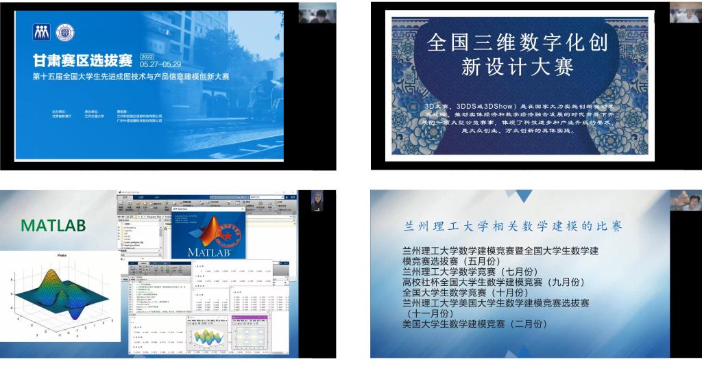 在优秀学长经验分享与交流部分,石疆涛同学通过学习python应用在数学建模方面的经验介绍,建议大家组成团队相互学习,需要对标学校关注的A类竞赛,发挥大家各自优势。马欢同学以自己参加“高教杯”全国大学生先进成图技术与产品信息建模创新大赛的经历介绍竞赛准备、训练、软件学习和竞赛技能等经验,并说明科创竞赛成果及获奖对综合测评成绩的贡献,并有利于提高学习专业知识和能力的重要性,马同学也强调团队作战的必要性。李浩森同学的分享从数学建模案例入手,介绍建模软件的学习逻辑和使用流程,从而强调学习数学建模思想和软件应用并重;李浩森同学从“科创是什么”、“科创有什么用”、“如何有一个好的创新想法”和“科创需要什么样的技能”等四个内容介绍参加学科竞赛的价值、意义及科创的基本技能和科创能力的提升,并建议同学们进入大学之后认真规划大学时光,需要端正态度、调整心态从一年级开始认真学习,针对科创李浩森同学要求一定要参照学校小法的认证的竞赛清单,选择好自己擅长竞赛类别、组好队伍、训练技能、做好竞赛素材,充分与指导教师的交流。三位高年级同学与参会学生进行互动交流并回答他们所提的问题。