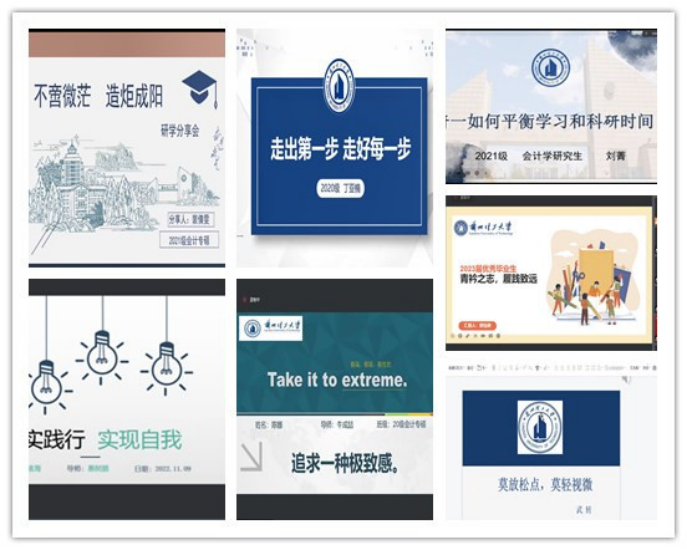 各位分享同学从学术研究、社会实践、综合素质提升、人际交往、情绪调整等各方面结合自己的特长进行了分享。为低年级学生顺利过好研学生活提供的借鉴之术。裴倩雯同学说,专业型硕士更加偏重实践,注重理论与实践相结合。因此我们进行学习要以职业需求、实际应用为导向。丁亚楠同学说,接受你不能改变的,改变你可以改变的,我们要接受现状,少抱怨、少焦虑,将时间投入到学术研究上,注重内心的丰满。陈娜同学分享了研究生三年的学习科研经历以及竞赛经验,并指出我们要做到可持续发展的极限,保持身心健康,以积极的心态面对挑战,对自己负责,自主学习,做到创新与突破。郭怡琳同学对于确定研究方向、投稿、审稿以及简历制作进行了详细分享,推荐了一些学习网站和软件,并指出我们要把握当下,提高核心竞争力,规划目标,脚踏实地得进行学习和科研。王绪海同学分享了自己的研究生阶段目标,详细介绍了考博申博、考公考编、找工作以及毕业条件的内容,推荐了投稿相关的公众号,并具体分析了研究生不同阶段应做的事情。刘菁同学建议从德智体美劳各个方面发展自己,以及在自我管理、研究培养方案、践行综测细则、平衡科研和学习时间五大方面分享了宝贵经验。参会同学积极反馈,分享会收获颇多。