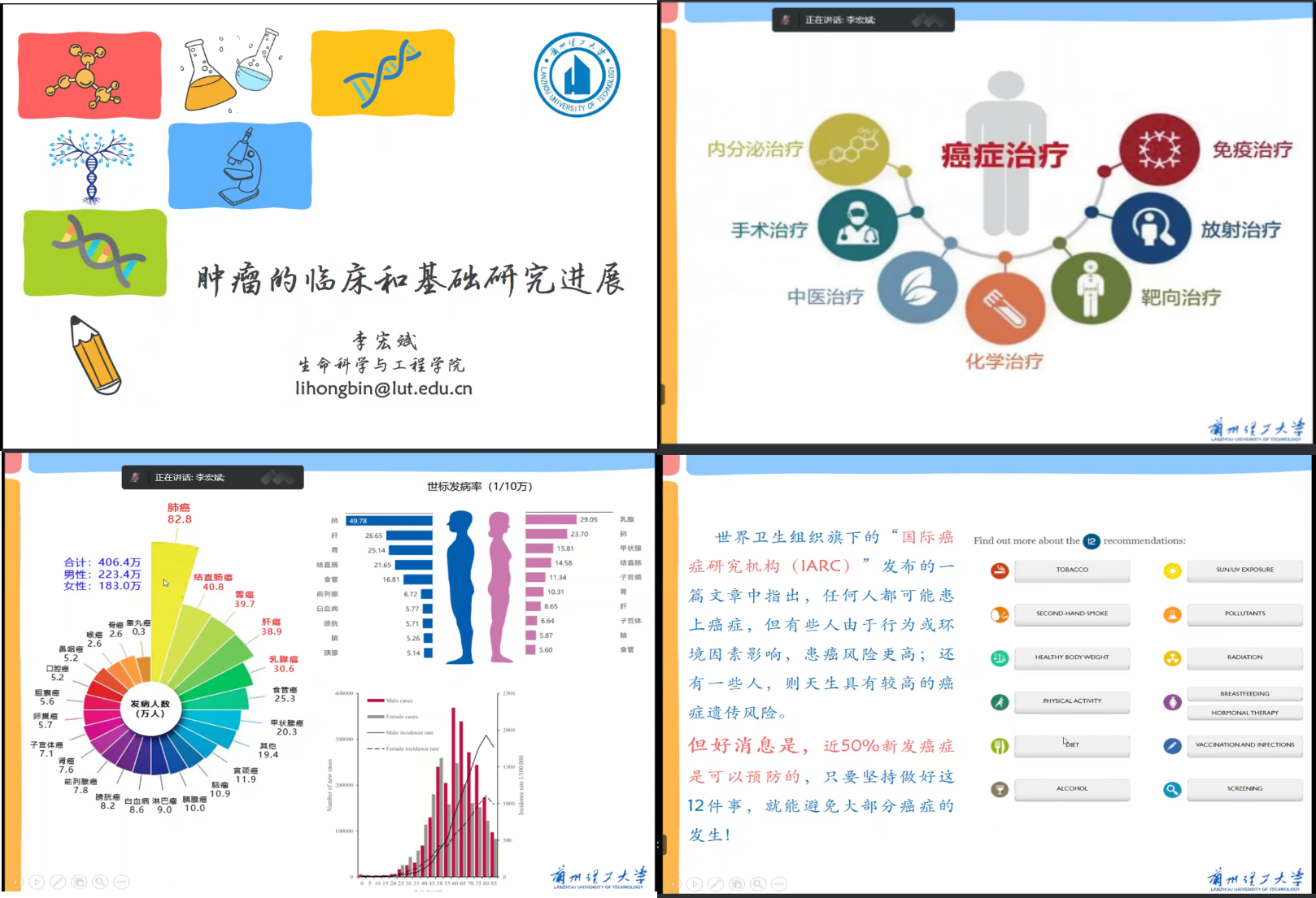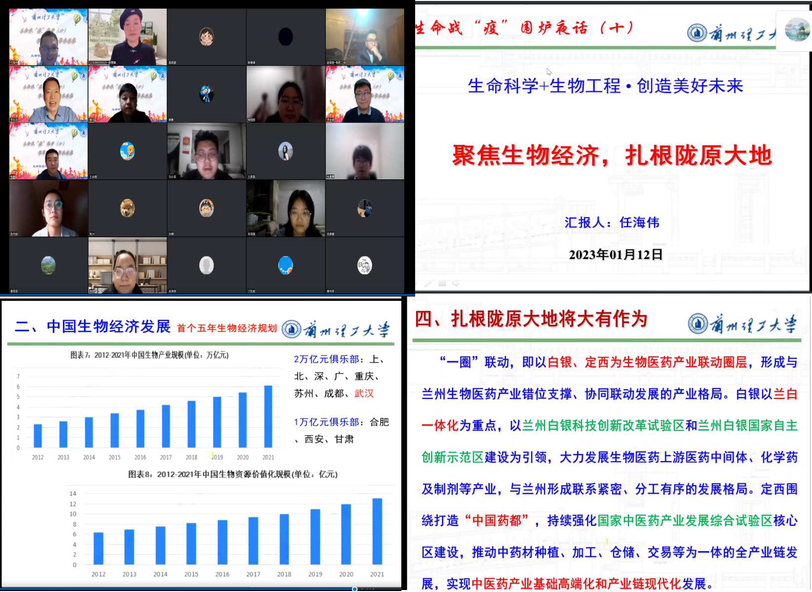 李宏斌在《肿瘤的临床和基础研究进展》中介绍了肿瘤临床研究进展和治疗方法,分享了在川大七年“筑基”、兰州生物制品所三年“养基”、中科院近物所博士“强基”,获得“李宏斌博士服”的奋斗经历。赵添堃在《我的留学生涯》中回顾了经过郑州大学药学、上海大学有机化学七年“阵痛”获得“新生”,“行万里路”到德国康斯坦斯大学(博士)、美国德州农工大学(博士后)“读万卷书”,学成归来报效祖国。任海伟在《扎根陇原大地,聚焦生物经济》中阐述了世界和中国生物经济及其未来发展方向,鼓励生命学子要热爱专业,将自己奋斗融入国家需求和时代发展的潮流之中,勇担历史使命,为实现中华民族伟大复兴的中国梦贡献青春的力量。