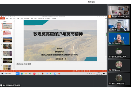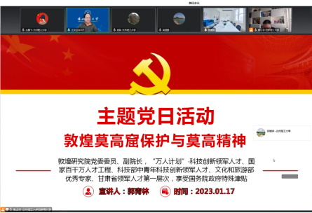 2023年1月17日下午,为了进一步深入学习二十大精神和省十四次党代会精神,切实把思想和行动统一到党的二十大精神上来,铸就社会主义文化新辉煌。土木工程学院建筑工程教师第1党支部联合岩土工程教师支部、给排水科学与工程教师支部,邀请敦煌研究院研究馆员、文旅部优秀专家、国家百千万人才工程、兰州理工大学兼职博士生导师郭青林副院长,通过腾讯会议开展主题党日活动。建筑工程教师第1党支部书记殷占忠主持活动,学院院长王文达教授致辞欢迎,郭院长作了题为《敦煌莫高窟保护与莫高精神》的报告,3个支部全体教师党员参加活动。