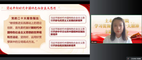 活动伊始,省级巡讲团成员、土木工程学院20级造价一班张莹博同学,做了题为《学习二十大 奋进新征程》的宣讲,内容紧扣党的二十大报告原文,学原文、悟原理。以青年人的方式,学习宣传党的二十大精神,号召广大青年学子以党的二十大精神为指引,牢记习近平总书记对广大青年的嘱托和希望,激励同学们从学习党的二十大报告中不断汲取精神力量和经验智慧,从而坚定理想信念,强化责任担当,矢志不渝地为第二个百年目标而奋斗。