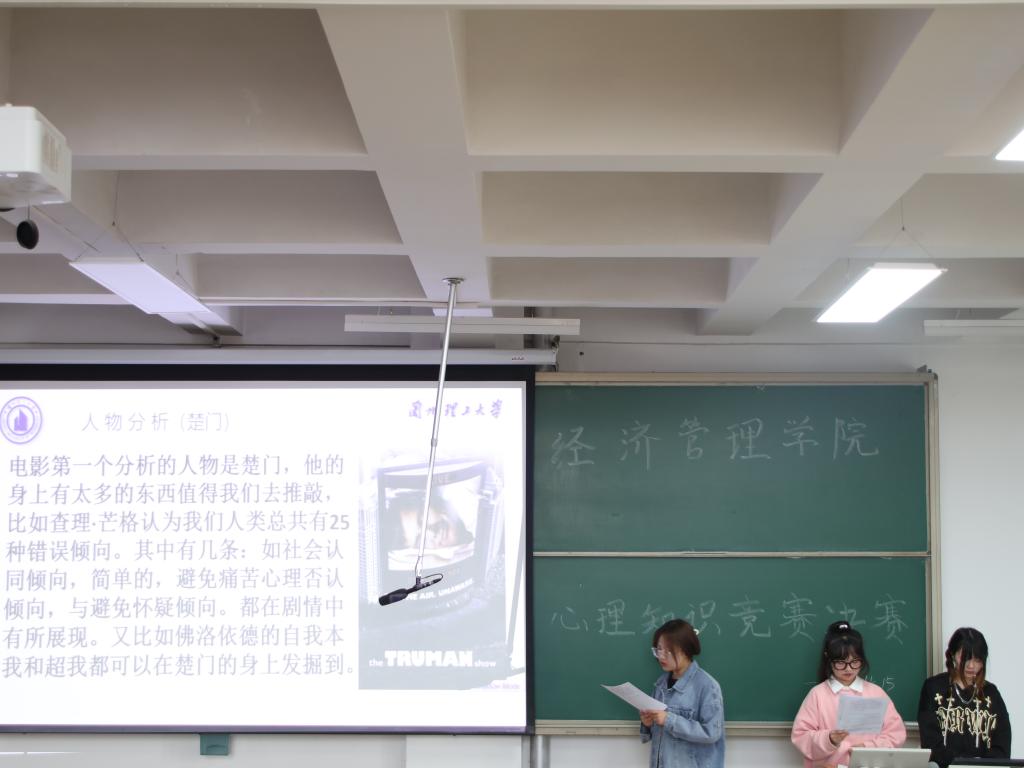 此次活动三人一组,初赛以闭卷形式对参赛同学心理方面的知识水平进行考察,题目主要考察学生对心理知识的掌握和自我心理的调控支配能力。笔试现场紧张有序,参赛同学沉着冷静答题。从笔试结果中筛选出了前十名小组进入决赛,各个小组以PPT的形式分享了一部有关心理健康的电影,讲述自我感悟与收获。各小组成员分享了《楚门的世界》、《心灵捕手》、《寻梦环游记》等电影,同学们声情并茂的演讲与扎实的心理知识储备得到了评委们的一致好评。待到所有队伍演讲结束,主持人对本次比赛的结果进行统计并宣布了获奖情况,其中第十六组夺得本次比赛桂冠,他们所分享的电影《楚门的世界》是极具代表性的作品,从多个角度分析了主角的心路历程:从迷惘好奇到坚守自我,最终突破自我的心魔。小组从中体会到,我们不能因为没有目标而一味地随波逐流,无论世界有多么虚假,要有寻求真相的勇气,要坚定的选择热爱生活。至此,本次活动圆满结束。