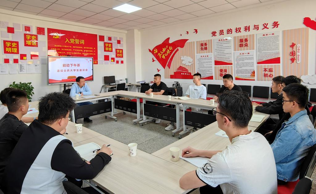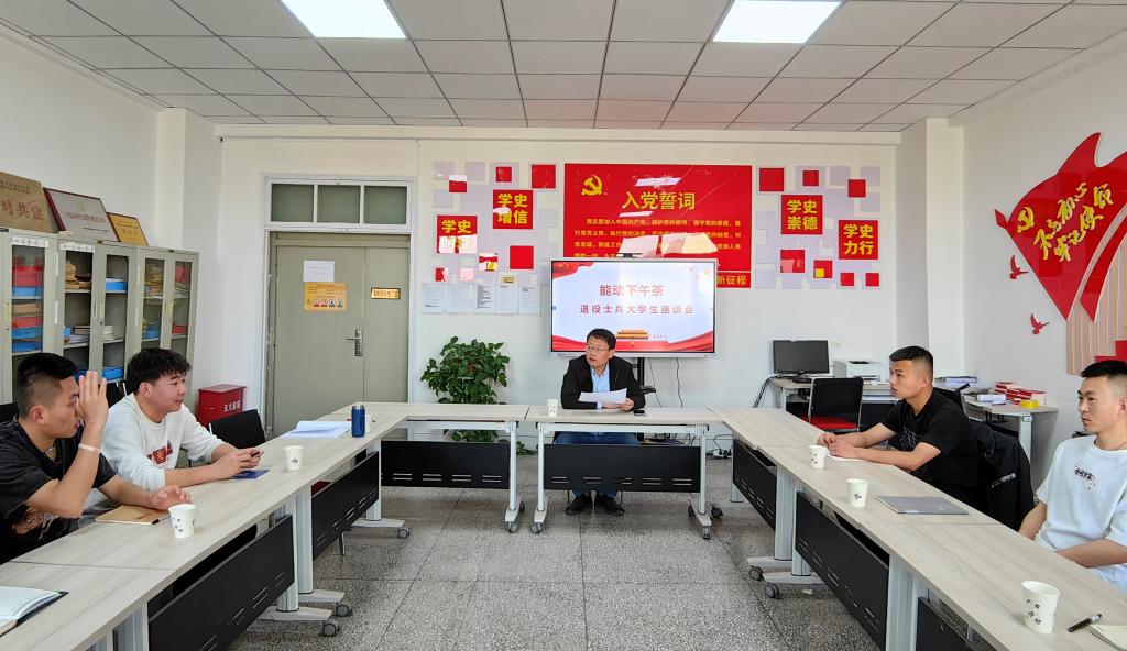 座谈会上,赵炜询问了同学们复学以来的学习、生活情况及感受,表达了对退伍复学同学们的关心与爱护,并结合自身工作经历和身边退伍的优秀学生成长经历,为同学们今后的学习之旅指明了方向,并期望同学们:一是要牢记退伍誓言,不改初心,努力奋斗,在学习上当标兵,在守纪上作表率,用实际行动影响和带动更多的同学积极向上,共创良好的学习生活氛围,在学校这个新战场上再创新的佳绩;二是要严格要求自己,始终坚守军人本色,以部队的优良作风带动和感染同学们,要以一隅推动一域,成为思想政治、学习科创、生活作风的引领者。退役学生纷纷表示会牢记退伍誓言,坚守初心,在以后的学习生活中积极奋进,勇站排头,努力用自己的成长经历和模范行动为身边的同学做好表率,不负学院关怀,不负老师殷切希望,争做校园的“排头兵”。