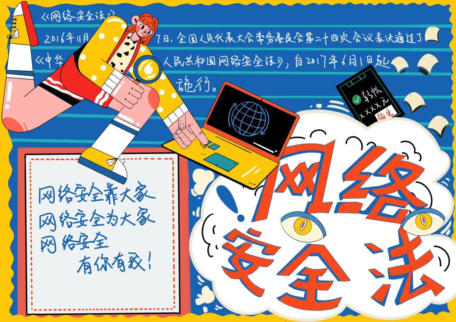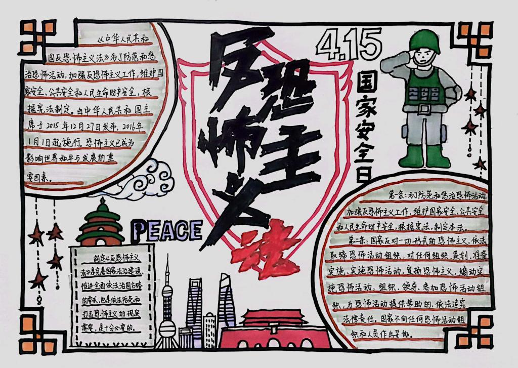 同学们围绕宪法和国家安全法、国防法、反恐怖主义法、等涉国家安全法律法规设计了手抄报,学院将优秀手抄报进行了公开展示。活动中,同学们以饱满的热情将本次活动所学到的相关法律知识呈现在画面上,紧扣主题,画面整洁美观且富有创意。