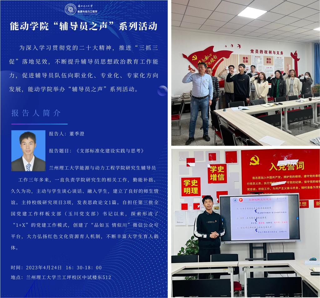 为不断提升辅导员的综合素质和工作能力,促进辅导员队伍向职业化、专业化发展。4月24日下午,能动学院在中试楼东512举办“辅导员之声”系列活动(第一期),学院党委副书记赵炜、全体辅导员参加活动。活动由组织员、学工办副主任赵继国主持。