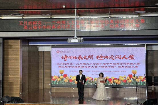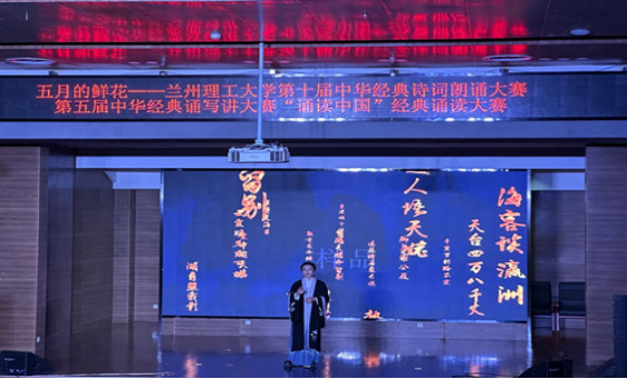 5月19日19时,由兰州理工大学教务处(创新创业学院)、校团委、文学院主办,行星诗会、国学会承办的五月的鲜花——兰州理工大学第十届中华经典诗词朗诵大赛暨第五届中华经典诵写讲大赛“诵读中国”经典诵读大赛决赛在彭家坪校区图书馆106报告厅举行,全校中外师生200余人一起聆听经典诵读,感悟中国传统文化。邀请甘肃省教育厅丁光明、兰州城市学院任丽花副教授、甘肃省广播电视总台青春调频副总监董志强、甘肃电视台主持人彭嘉、兰州职业技术学院朱艳君教授、文学院杨晓霭教授、李胜利副教授担任大赛评委,甘肃省广播电视总台青春调频对此次大赛进行了报道。