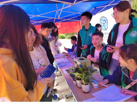 绿植领养活动得到了广大同学的热烈追捧和积极参与,小多肉、绿萝、草莓种子等,吸引了很多同学驻足,大家纷纷排起长队,通过参与环保知识答题、废旧物品兑换、写环保寄语、“套圈”游戏等互动活动,领取心仪的植物或种子,活动现场,气氛热烈,志愿者们在发放绿植的同时也现场宣传环保知识。