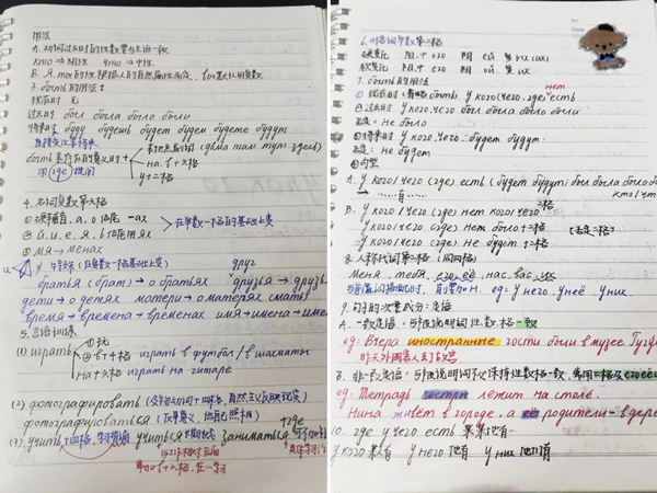 本次活动共收到25份笔记,尖锐闪光的笔锋将知识倾心吐露,行云流水的线条将智慧凝结成晶,字字句句都是同学们的积累与收获,尽显同学们优秀的书法功底和扎实的专业基础。经过综合评分,最终评选出一等奖1名,二等奖2名,三等奖3名,并推荐22级俄语班邱天同学、22级英语班何彤同学参加学校决赛。
