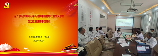 支部书记曹立宏以“深入学习贯彻习近平新时代中国特色社会主义思想,奋力推进健康中国建设”为专题,引领党员干部深入学习领会习近平新时代中国特色社会主义思想丰富内涵、核心要义和实践要求。着力领悟“十个明确”“十四个坚持”“十三个方面”“六个必须坚持”所蕴含的中国化时代化的马克思主义世界观和方法论。学习领悟党的十八大以来,习近平总书记发表的关于人民健康的七个方面重要论述,学习领悟党的二十大为推进健康中国做出的三个方面重要部署。回顾建国以来、新时代十年来在党的坚强领导下人民健康事业所取得的显著成果。学习了新时代推进健康中国、实现中国式现代化进程中人民健康事业践行“六个必须坚持”的基本路径。党课号召全体党员牢记“国之大者”,坚持新时代我党人民健康事业的基本遵循,切实增强“四个意识”、坚定“四个自信”、做到“两个维护”, 深刻领悟“两个确立”的决定性意义,从新时代卫生健康伟大实践中深刻认识“两个确立”的决定性意义。“学思想、强党性、重实践、建新功”,坚定理想信念,永葆政治本色;履职履责,做好本职工作;不忘初心,全心全意为人民服务,以奋发有为的精神状态和真抓实干的实际行动,保持时时放心不下的精神状态和责任担当,不负党和人民的重托,奋进新征程、建功新时代,坚持“三严三实”作风品格、积极践行“三抓三促”行动,在佑护师生健康的平凡工作中,在奋力推进健康中国建设中做出积极贡献。