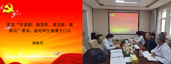 副书记、院长杨晓华党课主题为“学思想、强党性、重实践、建新功”,做好师生健康守门人。从“把握主题教育学习重大意义,提高学习自觉性主动性”“准确把握新时代卫生教育工作方针,把准工作方向性”“加强学校卫生健康工作,做好师生健康守门人”三个方面阐述习近平新时代中国特色社会主义思想关于“人民至上、生命至上”的大卫生大健康理念,阐述党的二十大以健康中国推进中国式现代化的宏伟擘画,阐述了建国以后、新时代十年来我国教育方针的发展变化,号召党员干部始终站稳人民立场,积极践行服务育人光荣使命,“五育并举”扎实落实党的卫生教育工作方针,将“人民对美好生活的向往,就是我们的奋斗目标”落实到学校卫生与健康教育的实践中,落实到医院改革发展的各项具体实践中,为培养德智体美劳全面发展的社会主义建设者和接班人担当作为、奉献力量。