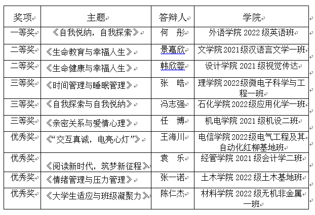 本次比赛评委从主题选择、设计方案与实际效果、参赛选手表现等角度进行评分,最终评选出一等奖1项,二等奖2项,三等奖3项,优秀奖4项。本次活动旨在通过以赛促行、以赛促学的形式,进一步推动班级心理健康教育活动的有效开展,发挥朋辈心理引导员在心理育人中的作用,提升朋辈心理引导员开展工作的能力和水平。(撰稿:孔艳赟;审核:党渭平)