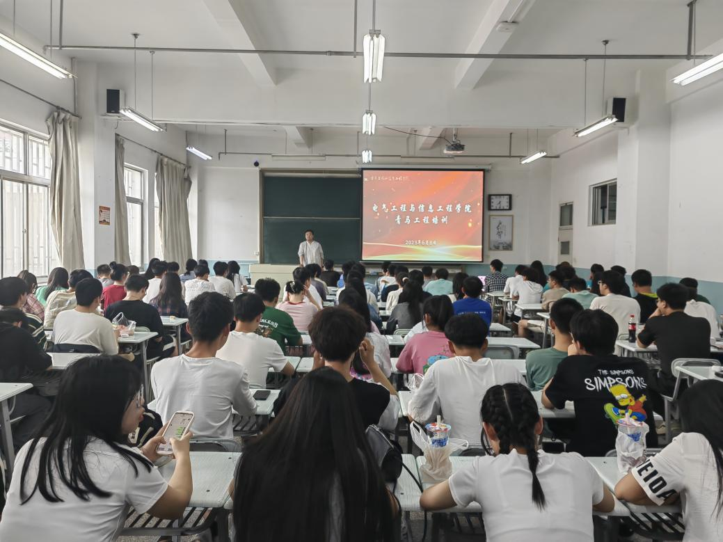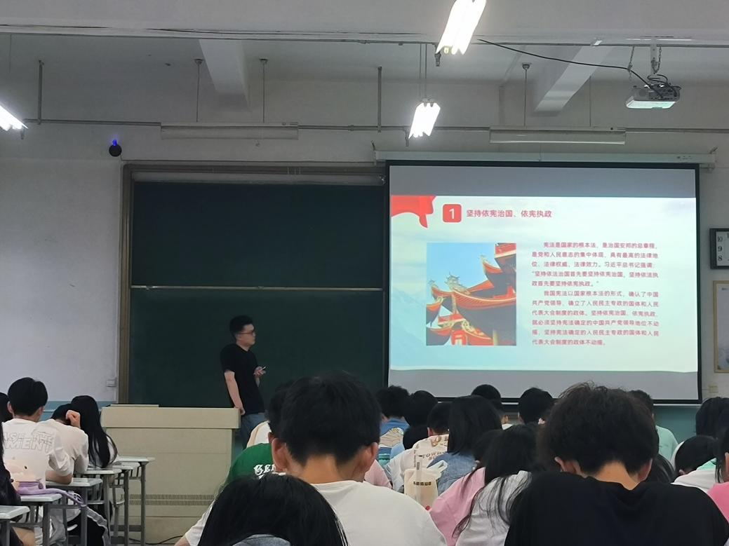2023年6月11日,电信学院团委在励志楼D104开展“青马工程”培训班第一次集中学习,学院辅导员赵天玮老师以《深入学习贯彻党的二十大精神 谱写法治中国建设新篇章》为题,为同学们做了这次讲座。讲座由学院团委书记成晨主持,100余名青马工程学员参加了此次活动。