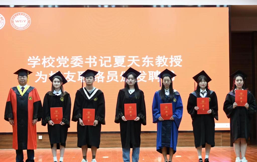 毕业典礼上,夏天东为校友联络员颁发聘书,鼓励他们及时传递母校信息,积极联络校友感情,为学校下一个百年事业发展提供更好的校友资源。