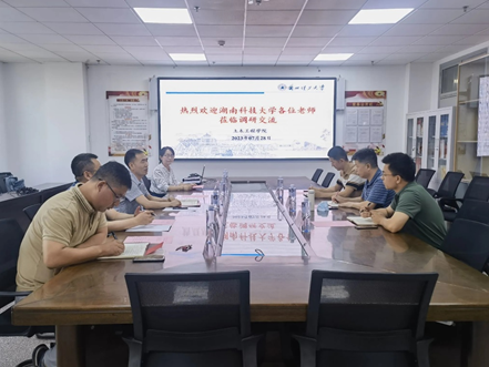 陈永泰代表学院对来宾的到访表示热烈欢迎,并从学院的发展历史、办学定位、专业建设、教学管理、科研工作和人才培养等方面进行了介绍,也希望双方以本次调研为契机,加强教学和科研的交流合作,促进学科和专业高质量内涵发展。祝明桥介绍了湖南科技大学土木工程学院的基本情况,陈林说明了此次调研的目的和任务。会上双方就土木工程专业方向设置、培养方案修订、实习环节安排、毕业设计企业导师聘请和过程管控、学生就业和党建工作等方面进行了深入交流。此次调研为双方后续在专业建设、人才培养、师资队伍、课程建设、学生就业和党建工作等方面的合作奠定了基础。