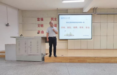 为做好研究生新生的思政教育、学术教育和安全教育工作,激励学生以饱满的精神、昂扬的姿态顺利开启研途新征程。9月4日下午,机电学院于彭家坪校区集贤楼108教室进行了研究生“开学第一课”主题教育活动。学院副院长靳伍银主讲,全体2023级研究生参加。