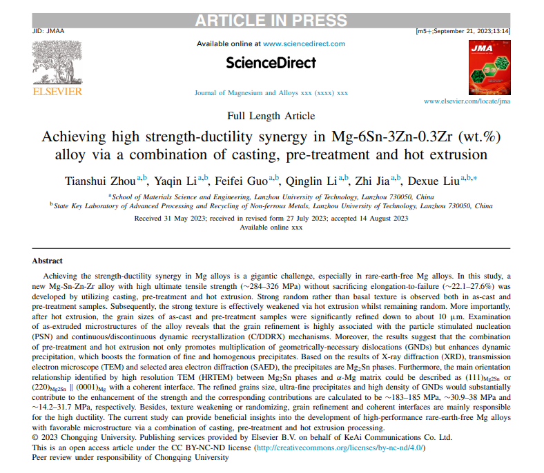 省部共建有色金属先进加工与再利用国家重点实验室刘德学教授团队,在镁合金强塑性调控及其变形机制领域取得重要进展,相关成果以题为“Achieving high strength-ductility synergy in Mg-6Sn-3Zn-0.3Zr (wt.%) alloy via a combination of casting, pre-treatment and hot extrusion”在线发表于国际材料科学领域TOP期刊《Journal of Magnesium and Alloys》(影响因子:17.6,中科院一区),该期刊位居全球SCI收录的79种冶金与冶金工程类期刊第1位。论文第一作者为材料科学与工程学院博士生周田水,通讯作者为刘德学教授。省部共建有色金属先进加工与再利用国家重点实验室、材料科学与工程学院为第一通讯单位。