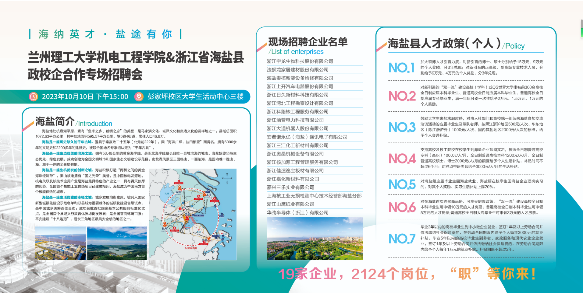 为全面贯彻落实党中央、国务院做好高校毕业生就业工作的指示精神和决策部署,做实做细就业指导服务工作,引导毕业生转变择业就业观念,更好地为广大用人单位和毕业生搭建双向选择的平台,10月10日下午,机电工程学院特邀浙江省海盐县县委组织部、人社局举办了2023年“海纳英才·盐途有你”兰州理工大学机电工程学院专场招聘会。招聘会邀请到海盐县人社局就业中心主任赵沈军、学校就业指导服务中心副主任陈育苗、机电工程学院党委书记党渭平以及海盐县19家企业出席,此次招聘会的19家企业,提供岗位84个,需求人数达2124人,涉及制造业、建筑业、信息传输和化工等9个行业,涵盖了材料、机械、土木、电气、石化、市场营销、会计学等多个专业。专场招聘会由机电工程学院党委副书记骆焕涛主持。