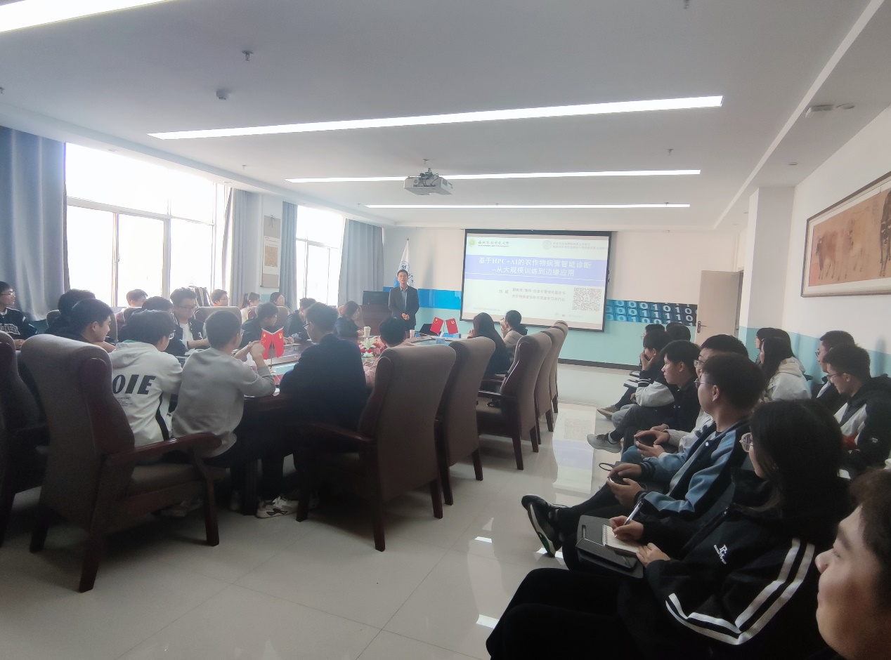 应计算机与通信学院邀请,西北农林科技大学刘斌教授于10月22日来我校进行学术交流,为我校师生做了“基于HPC+AI的农作物病害智能诊断——从大规模训练到边缘应用”的学术报告,并分享了研究生培养方面的宝贵经验。报告由副院长李晓旭主持,计算机与通信学院的40余名师生参加。