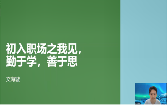 高年级学生代表分别就自己的本科学习生活和毕业就业经历分享自己的心得体会。首先,20级本科生彭耀清以“我的大学时光”为题,分享了自己的本科学习经验与方法,他从“能力、动机、心态、机遇”四个方面并结合自身经历为大家介绍本科阶段的学习方法与感悟,建议同学们要远离“内耗”,学会自我调节,以积极的心态面对学习和生活;要正确看待并对待竞争。随后,工作在中国铁建港航局第一工程分公司的19级毕业生文海璇回忆了自己的学习经历,详细地为同学们介绍了自己从学生时代到就业以来的所思所想和工作现状,他希望同学们要在充分发挥个人优势的同时学会尊重他人,在工作中培养自己的沟通协调能力,努力发挥自己的价值。
