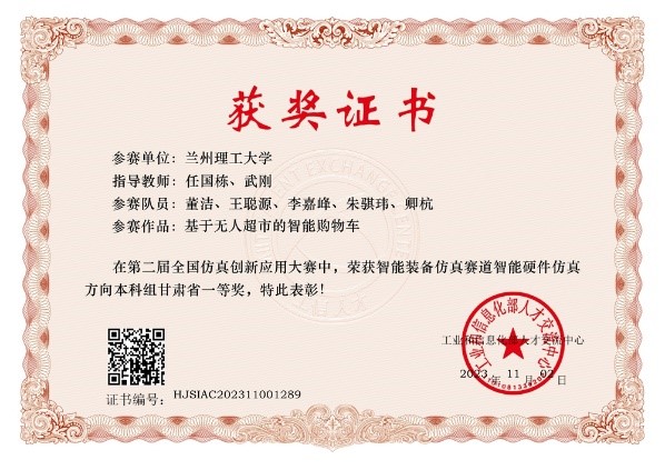 此次大赛,理学院高度重视、精心组织,从资源整合到技术指导打造最佳的竞赛环境,为参赛学生提供全面保障。学院任国栋老师、武刚老师指导的董洁同学团队的作品《基于无人超市的智能购物车》(团队成员:董洁、王聪源、李嘉峰、朱骐玮、卿杭),以省赛一等奖的好成绩入围全国总决赛。总决赛采取“线上答辩”的形式开展,答辩学生以扎实的理论知识和专业技能为支撑,对团队作品进行了全面而细致的讲解。该团队最终荣获智能装备仿真赛道智能硬件仿真方向本科组全国二等奖,为学校争得了荣誉。