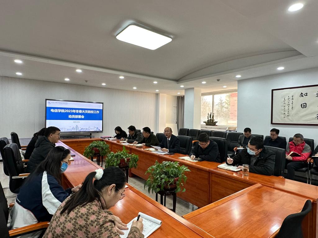 2023年12月21日,学院召开了2023年冬春火灾防控工作动员部署会,解读了《电信学院2023年冬春火灾防控工作方案》,并对学院下一步火灾防控重点工作进行了详细部署,认真贯彻落实习近平总书记关于安全生产和消防安全的重要指示精神,进一步提高师生消防安全责任主体意识,强化风险意识,树牢底线思维,时刻紧绷安全这根弦,以时时放心不下的责任感、紧迫感,全力以赴打好冬春季火灾防控攻坚战。