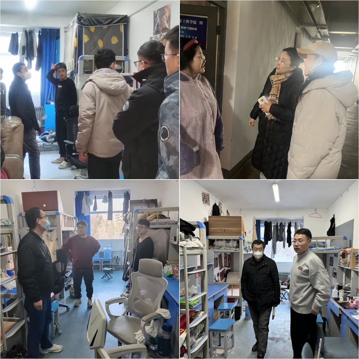 2024年1月14日,学院领导班子成员带队开展寒假前安全大检查,深入到办公室、工作室、实验室、学生宿舍等区域进行全面细致的检查。在检查过程中,对学生宿舍和研究生工作室等重大区域存在的卫生情况、用电情况做出了指导和建议,并提醒同学们妥善保管个人贵重物品,离校前关好电源及门窗,并对发现的隐患及时排除、整改;同时与在场师生和将要离校回家的同学进行了亲切的交谈,鼓励留校同学珍惜留校时间加强学习、开展科研,叮嘱回家同学提高安全意识,注意出行安全。