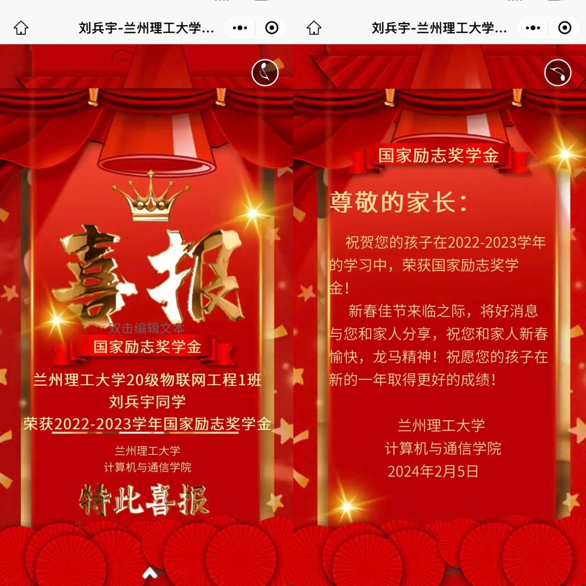 (学院为学生制作的国家奖学金的电子版喜报小程序截图)