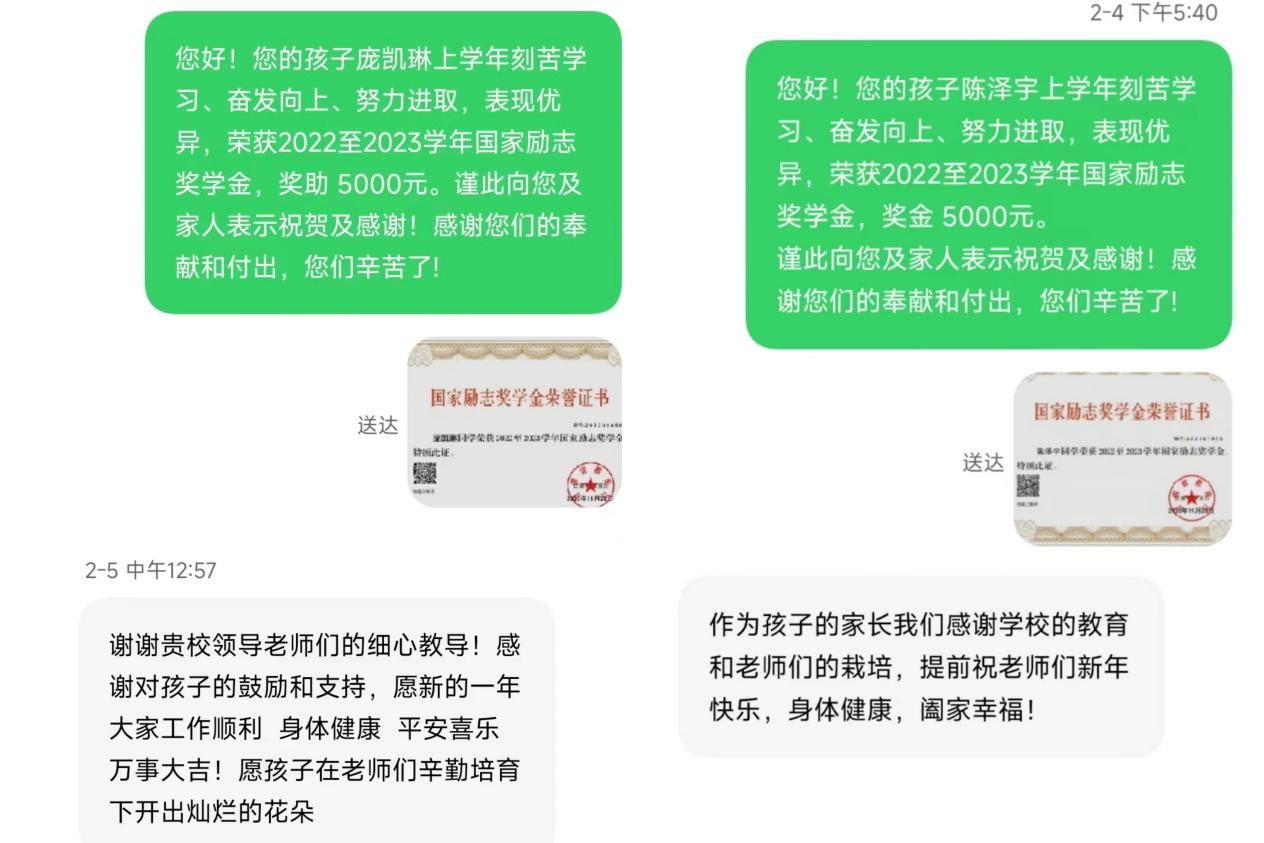2022级软件工程四班赵烜锐家长表示:这份荣誉不仅是对孩子本人的肯定,更是对我们家庭教育的一种认可。我要衷心感谢国家和学校给予孩子的这份殊荣。国家励志奖学金是一种极高的荣誉,它不仅提供了经济上的支持,更是激发了孩子们的学习热情和创新精神。这份奖励是对孩子过去努力的肯定,也是对未来发展的鼓励。
