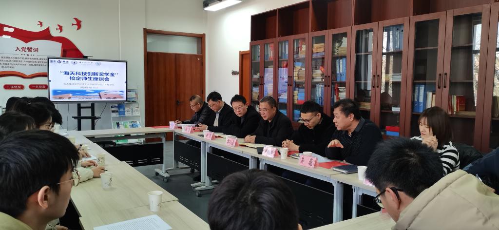 座谈会上,赵炜从学校奖助情况、海天科技创新奖学金设立初衷等方面展开了探讨;闵为就液压专业的学生情况、学院科研情况、企业交流情况作了交流,希望能促进双方进一步合作;海天集团岳巍、谢波娜结合企业发展情况、自身成长经历鼓励同学们常怀感恩之心,保持青年的锐气,与企业共同成长;学院辅导员张慧琴对学院2023年海天科技创新奖学金评选情况进行了介绍;获奖学生代表纷纷对海天集团表达了诚挚的谢意,并进行了专业和就业方面的沟通学习。