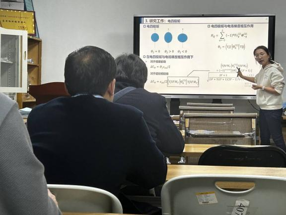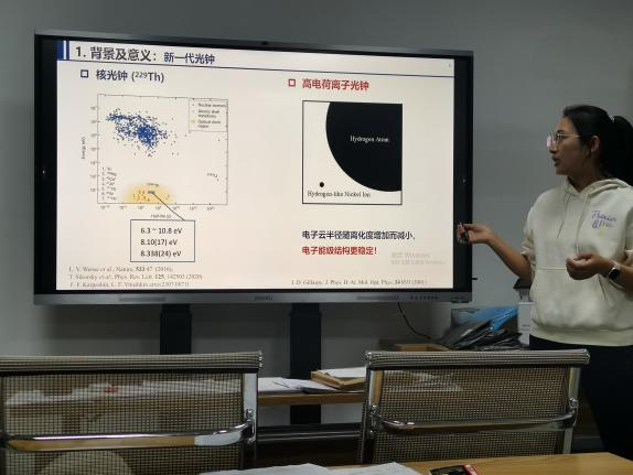 青年教师张婷贤做了科研成果学术报告,报告中张老师分享了原子结构精密计算方面的研究发展历程、研究领域前沿发展及个人科研进展和初步成果,并与参会师生深入交流讨论。