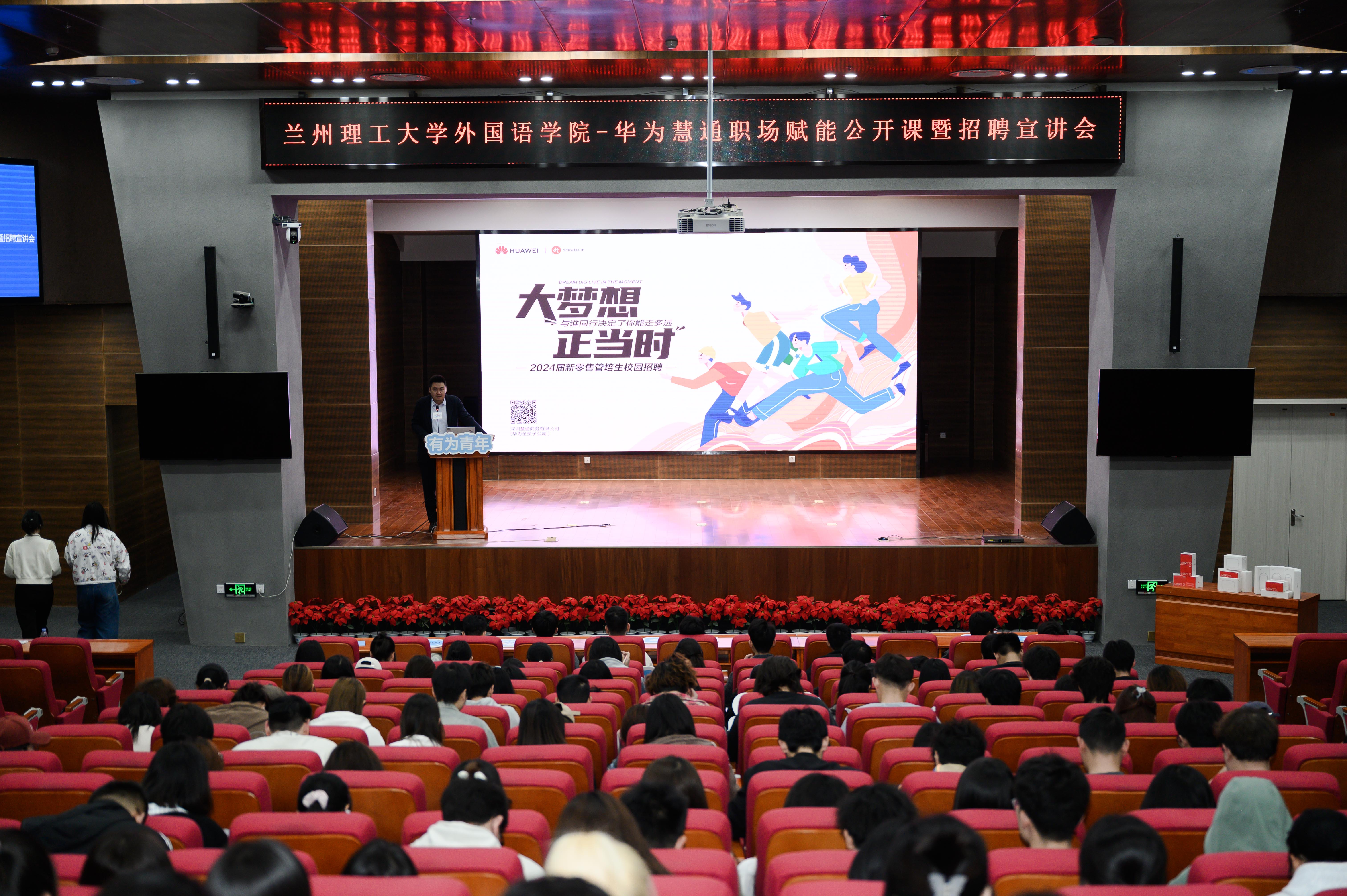 4月16日下午,外国语学院邀请华为投资控股有限公司全资子公司深圳慧通商务有限公司在问鼎堂106报告厅举办“职场赋能公开课暨招聘宣讲会”。华为终端BG甘肃终端政企主管张振宁、业务部HRBP杨月昆主讲,外国语学院、计通学院、经管学院、法学院等相关学院近200名学生参加。学院党委副书记潘永锋主持宣讲会。