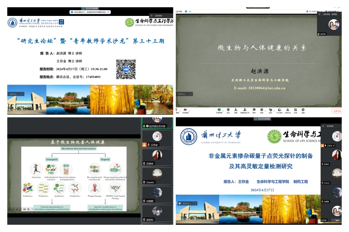 为提升研究生和青年教师的学术素养,推动学术交流和研究创新,生命科学与工程学院于2024年4月17日晚,生命科学与工程学院第33期“研究生论坛”暨“青年教师学术沙龙”活动在线上举办。报告会由青年教师王存金主持,生命学院生物工程及生物与医药专业硕士研究生参与了报告。