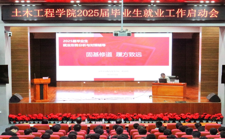 近日,土木工程学院2025届本科毕业生就业工作启动会在彭家坪校区问鼎堂106报告厅召开。学院邀请学校学生就业指导服务中心副主任陈育苗、就业指导服务科苗军为2025届本科毕业生作就业指导。学院院长王文达作动员讲话。2025届本科毕业生参加会议,会议由学院党委副书记王仪杰主持。