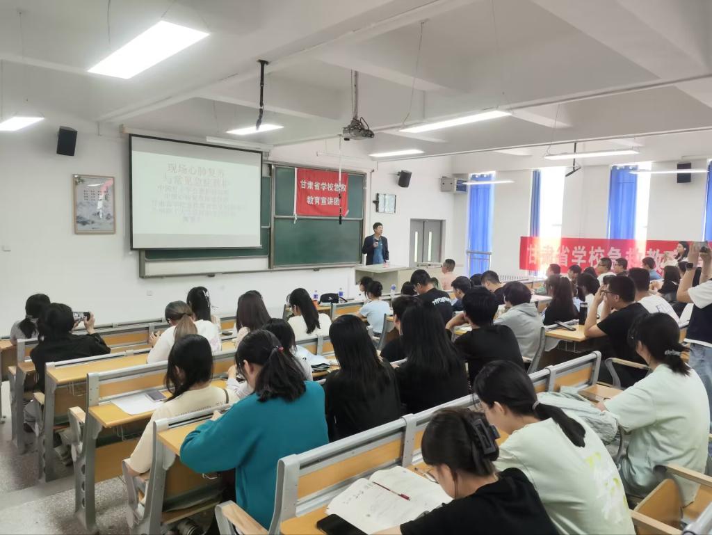 6月12日下午,生命学院与校医院在彭家坪校区蔚云楼(原西教6号楼)104教室共同组织了一场别开生面的应急救护与实验室急救知识培训活动。本次活动邀请了甘肃省学校急救教育宣讲团秘书长、校医院综合外科主任郭爱军、护士李学麟,公卫科王璐瑶担任培训师。生命学院的师生代表和校医院180余人积极参与了此次培训,活动由生命学院李康老师主持。