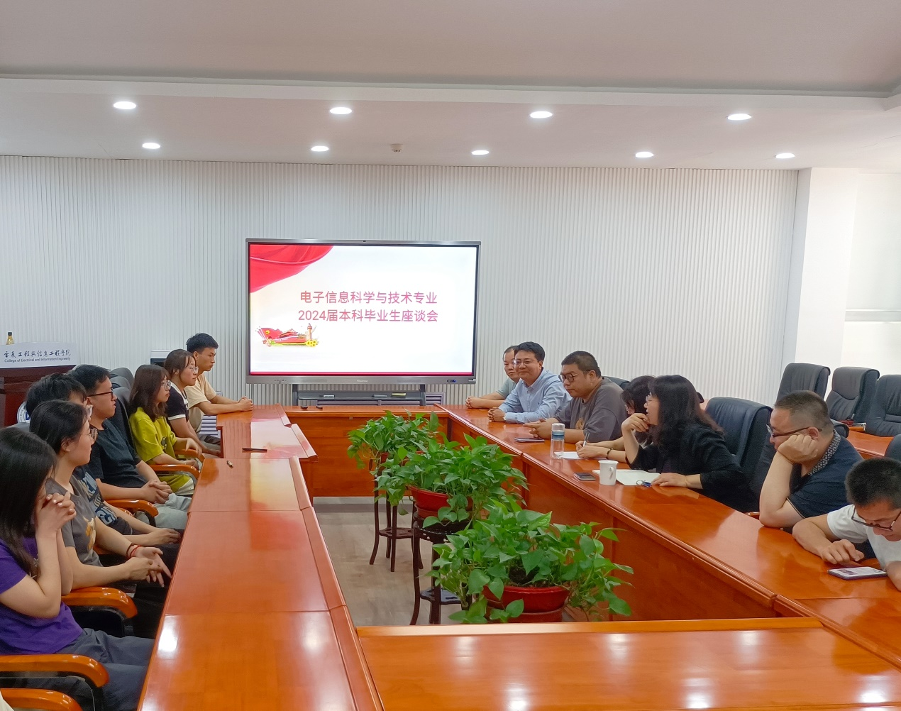 2024年6月13日,电信学院在彭家坪校区舒卷楼会议室召开了电子信息科学与技术专业2024届毕业生代表座谈会。电信学院副院长张宏亮,系主任黄玲,专业课老师代表,辅导员老师代表,班主任老师及二十余名毕业生学生代表等出席了会议,系主任黄玲老师主持了会议。