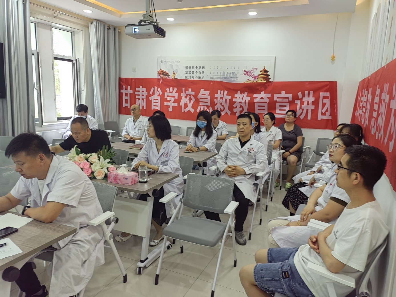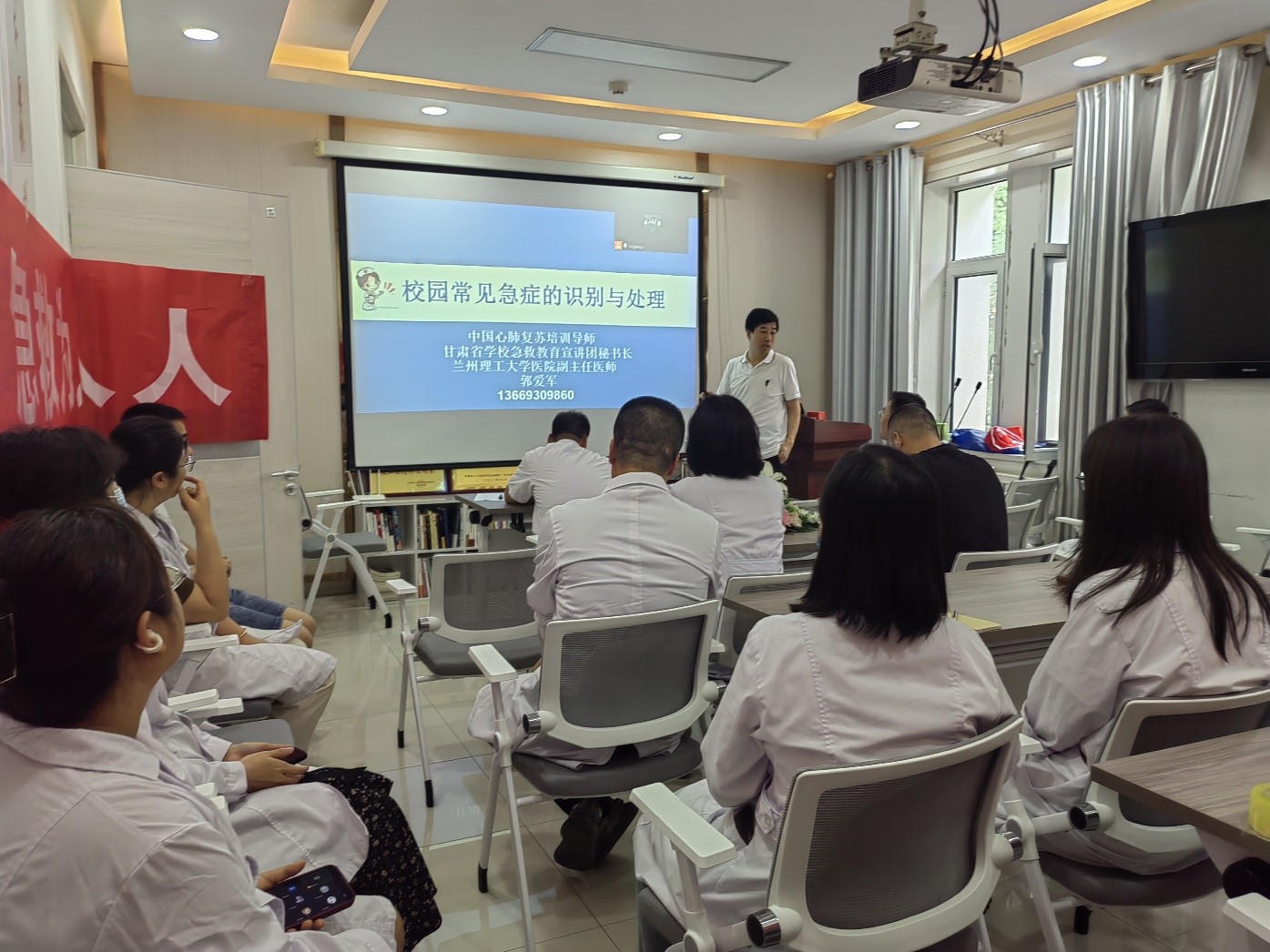 为认真贯彻落实全国急救教育试点学校建设任务的具体要求,开展校园常见急症健康教育技能培训,提升医护人员健康科普能力,7月8日下午校医院在三楼会议室举办了专题培训活动。医院“红柳党员健康志愿者”“甘肃省急救教育宣讲团秘书长”副主任医师郭爱军做了题为“校园常见急症的识别及其处理”的培训。培训由校医院院长杨晓华主持,全体员工60多人线上线下同步参加培训,通过开展急救培训,旨在提高广大员工对急救知识的认识和掌握,牢固树立“生命至上、健康至上”的急救理念,积极传播“人人学急救,急救为人人”的急救宗旨。