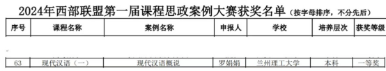 在诸多项案例中,兰州理工大学文学院教师罗娟娟脱颖而出,以“加强语言文明教育,助力时代新人培养”为主题,以《现代汉语(一)》课程中的“现代汉语概说”为课程思政示范案例,参加了此次活动,并荣获一等奖。(撰稿:郭凯峰;终审:张浩辰)