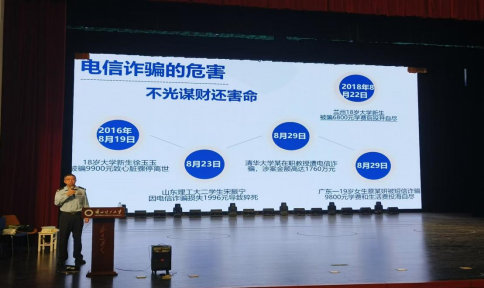 2024年9月25日晚7:30,理学院组织全体新生参加2024级新生入学教育系列活动之防电信诈骗讲座。讲座由七里河反诈宣传中心的马顺延警官主讲。