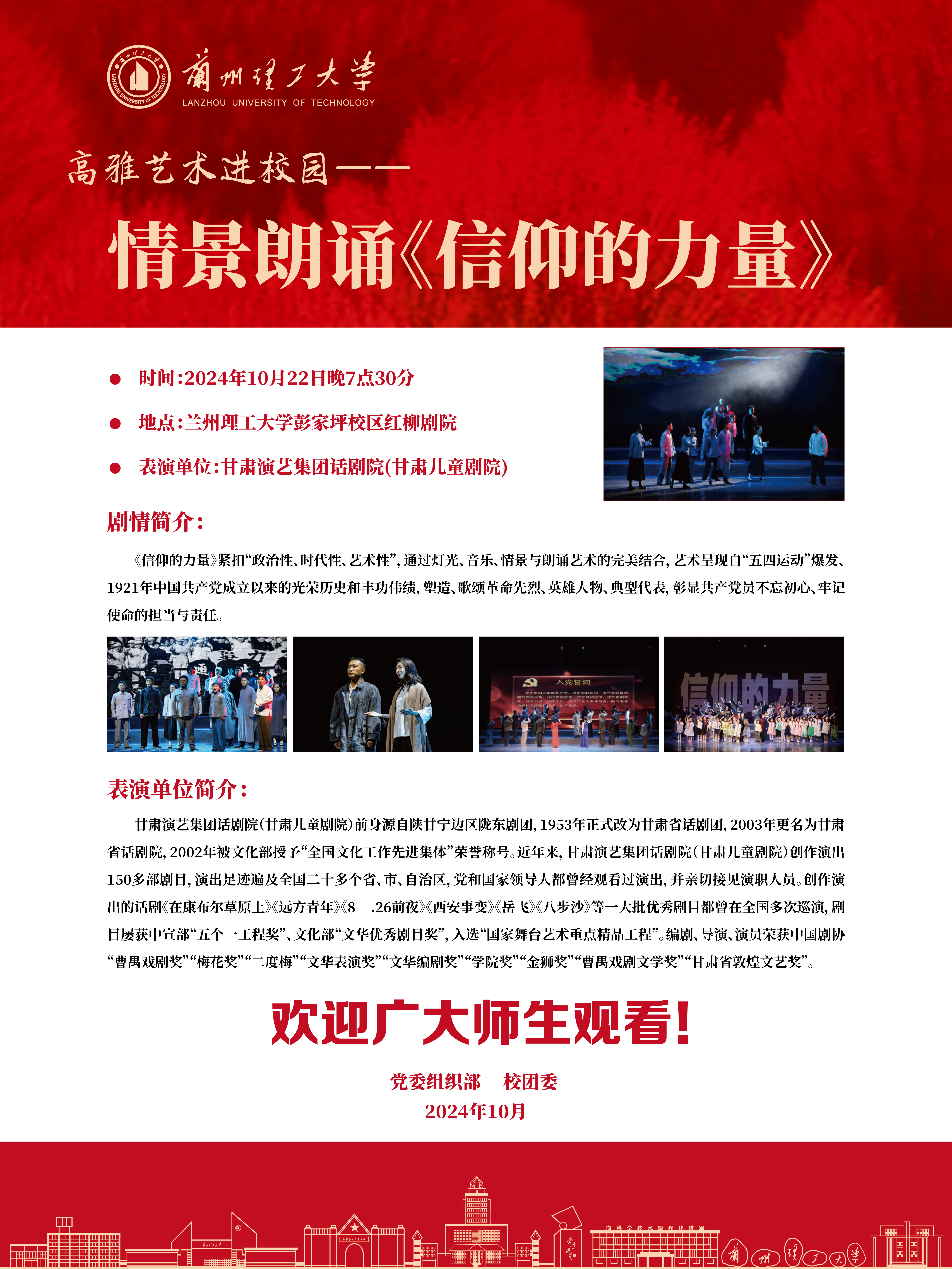为庆祝中华人民共和国成立75周年,弘扬伟大建党精神,喜迎学校第四次党代会的胜利召开,引导广大师生厚植爱党爱国情怀,以昂扬向上的精神风貌和奋发有为的实际行动为学校发展贡献力量,学校特举办高雅艺术进校园之情景朗诵《信仰的力量》演出。欢迎广大师生观看!