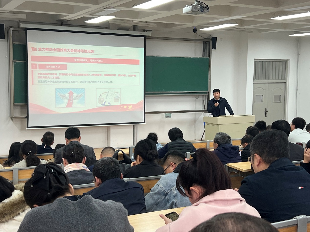 习近平总书记在全国教育大会上的重要讲话,为建设教育强国指明了前进方向、提供了根本遵循。会议强调,作为教育工作者,全院教职工要深入学习贯彻全国教育大会精神,把思想和行动统一到习近平总书记重要讲话精神和党中央决策部署上来,着眼新时代,站在学校发展的新起点上,全体教职工要以不进则退、慢进亦退的危机感;枕戈待旦、只争朝夕的紧迫感;追赶进位、舍我其谁的责任感;创新举措、勇毅前行,增强责任感和使命感,以实际行动献礼学校四次党代会,努力推动学校高质量发展和教育强国建设。(撰文:南飞;终审:穆龙)