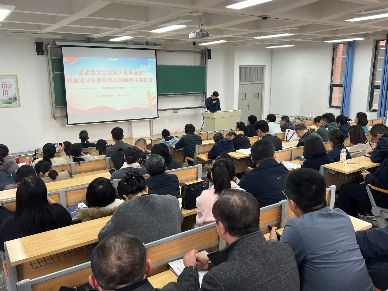 为深入学习宣传贯彻习近平总书记在全国教育大会上的重要讲话精神,落实学校《关于开展全国、全省教育大会精神“大学习”活动的工作方案》要求,11月12日下午,经济管理学院召开全院教师大会,学习全国、全省教育大会精神。学院党委书记穆龙带领大家从深入学习习近平总书记重要讲话精神,深刻认识全国教育大会的重要意义,全力推动全国、全省教育大会精神落地见效等方面进行了学习。